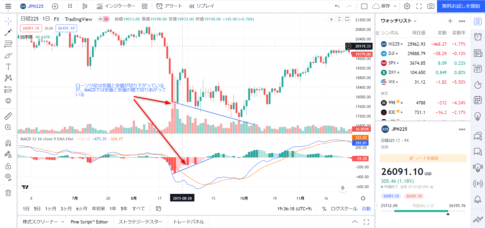 価格とテクニカル指標(MACD)が逆になっている状況のことです。MACDなどのテクニカル指標は買われすぎ、売られすぎを示すものであり、これが一定以上になると相場反転の可能性の考え方があります。