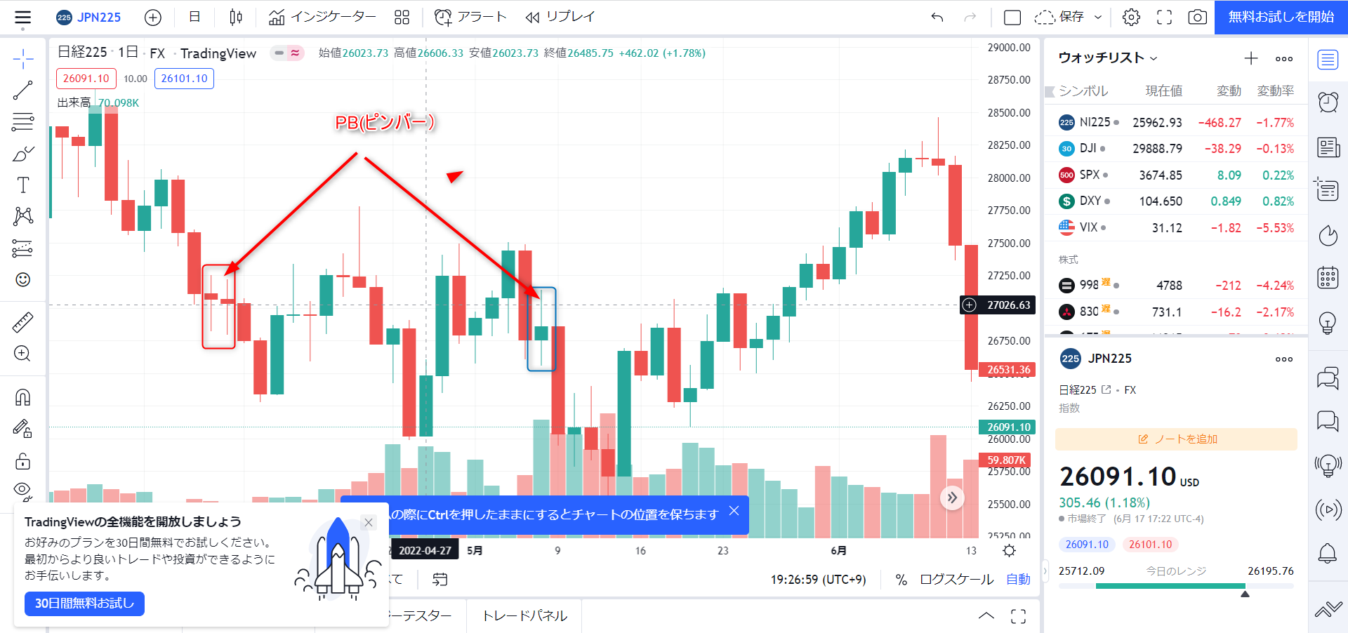 私の場合はPBを使いますが、それ以外にも上記で挙げたインジケータを組み合わせて、より環境認識の精度を上げてやっています。