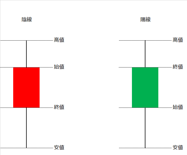 ・ローソク足:価格の始値、終値、高値、安値を表現しているものです。始値は最初についた価格、終値は最後についた価格、高値は当時時間帯について一番高い価格、安値は逆に一番安い価格のことです。