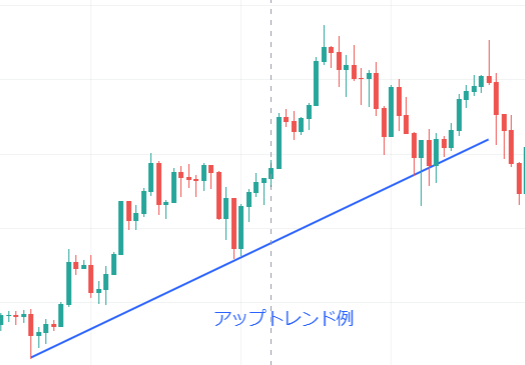 相場の傾向、価格が上昇傾向にあるのか下落傾向にあるのかを示すツールでアップトレンドの場合は、各ローソク足の安値部分で線を引いたもので、ダウントレンドの場合は各ローソク足の高値部分で線を引いたものです。