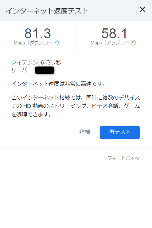 ちなみに実効速度を計るオンラインツールを利用しました。googleでインターネット速度テストで検索すると測定できます。